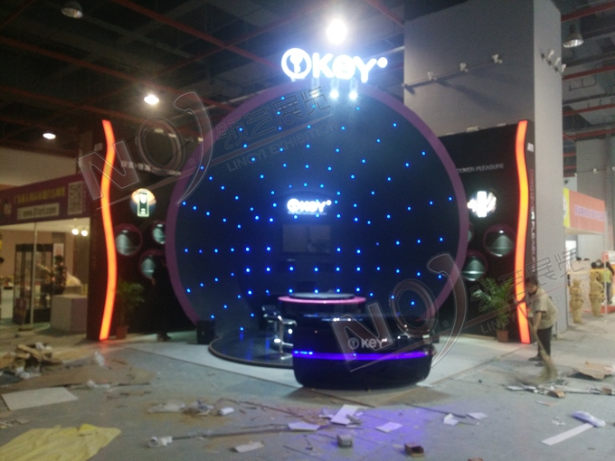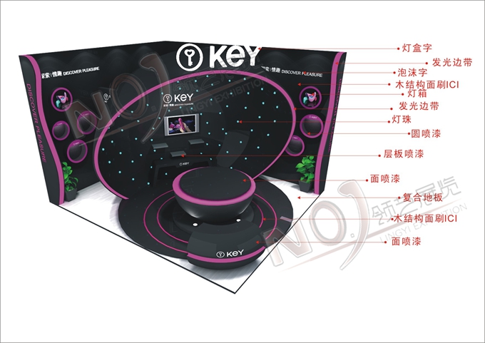 契合KEY的品牌形象和產(chǎn)品特性,采用框型結(jié)構(gòu),再搭配燈具燈光的效果,襯托出展位浪漫、朦朧的氛圍,突出一種尊貴、躍動的時尚品味。