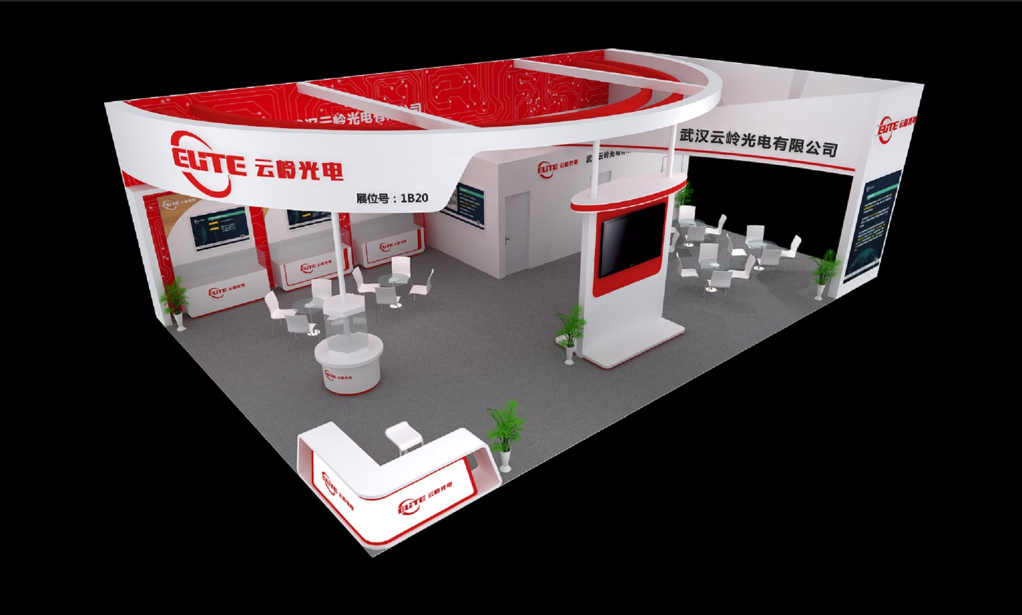 契合云嶺光電的品牌形象和產(chǎn)品特性,采用弧形結(jié)構(gòu),再搭配燈具燈光的效果,襯托出展位大氣、豪華的氛圍,突出一種簡(jiǎn)約、時(shí)尚的品味。