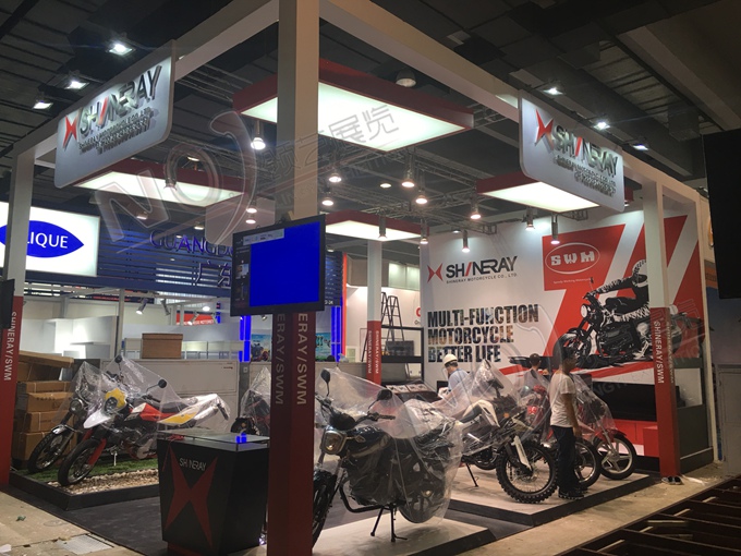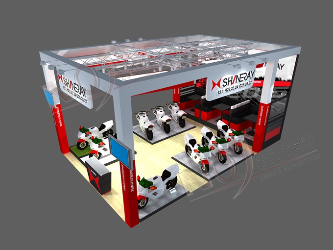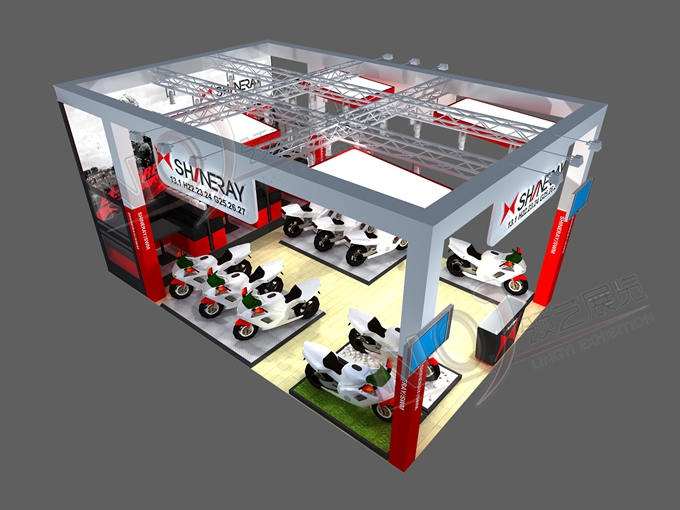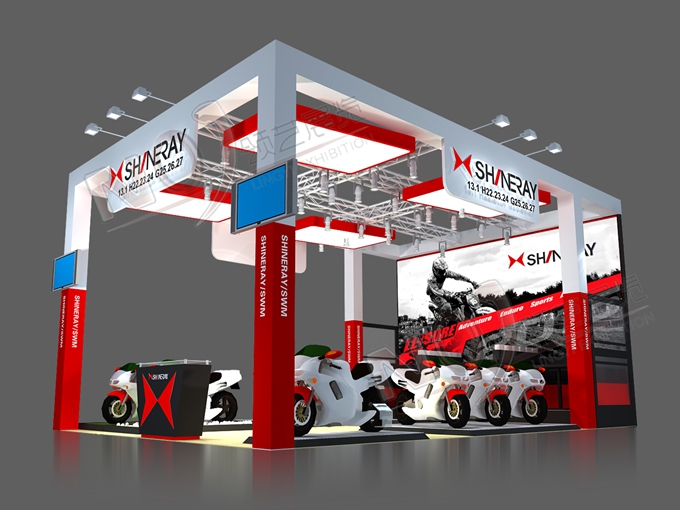 契合鑫源摩托的品牌形象和產(chǎn)品特性,采用矩形結構,再搭配燈具燈光的效果,襯托出展位簡約、時尚的氛圍,突出一種現(xiàn)代、簡約的時尚品味。