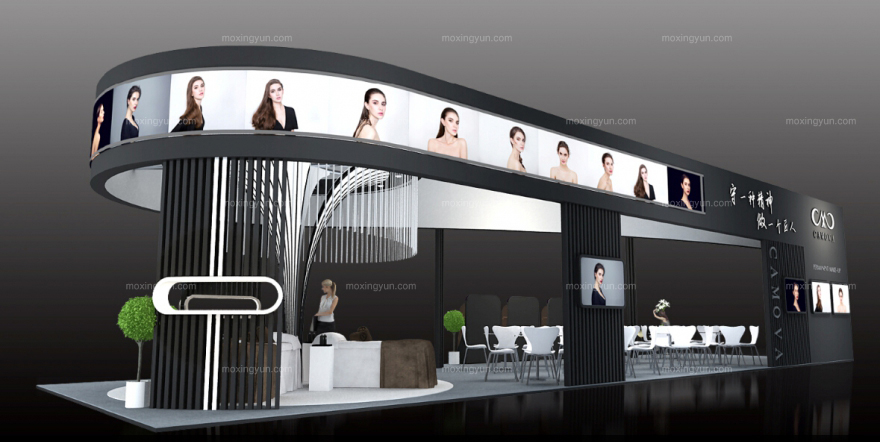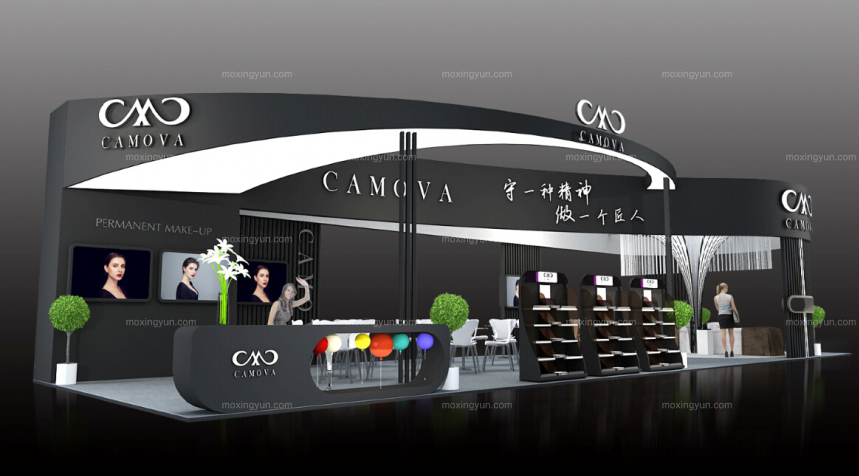 契合卡莫亞合成的品牌形象和產(chǎn)品特性,采用線條,再搭配燈具燈光的效果,襯托出展位簡(jiǎn)約、舒適的氛圍,突出一種現(xiàn)代、高端的時(shí)尚品味。