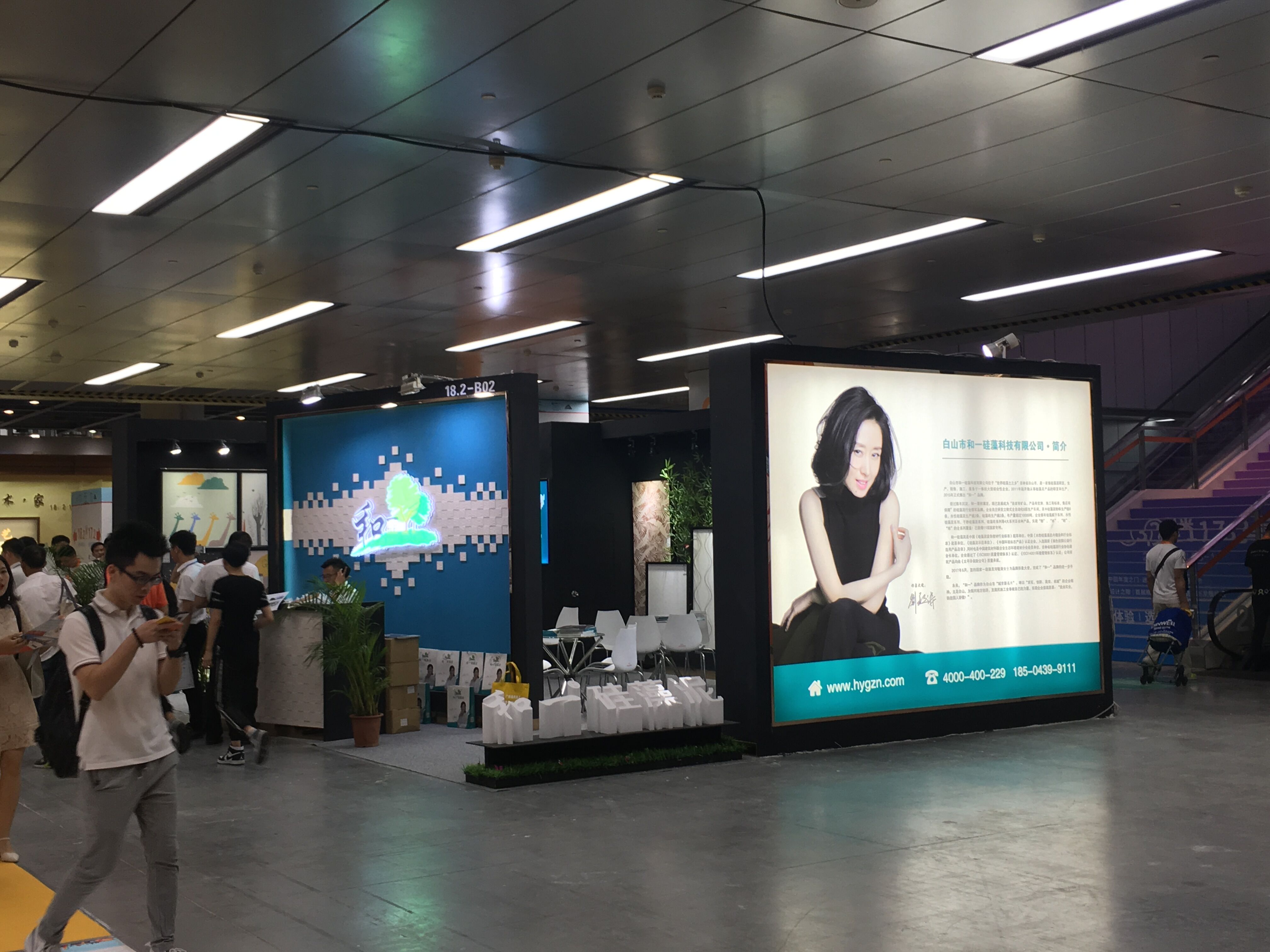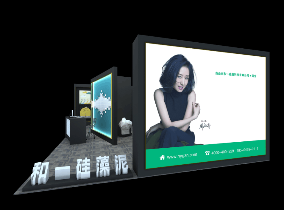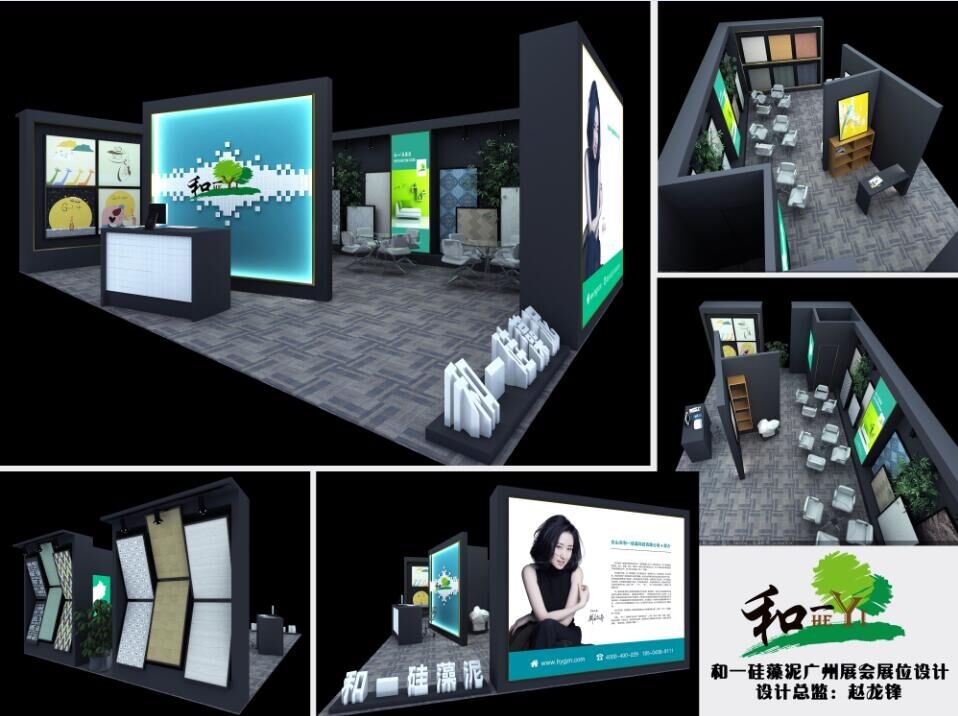 契合和一硅藻泥的品牌形象和產(chǎn)品特性,利用黑色突出產(chǎn)品,再搭配燈具燈光的效果,襯托出展位現(xiàn)代、突出一種現(xiàn)代、高端的時尚品味。
