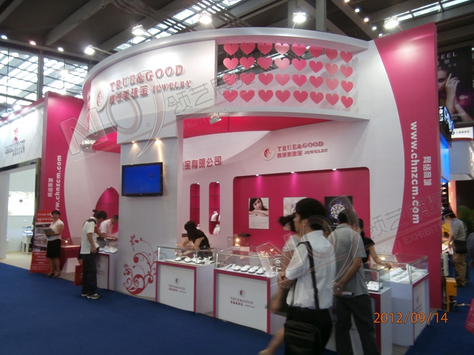 契合真誠美珠寶的品牌形象和產品特性,以弧形結構為主造型,再搭配燈具燈光的效果,襯托出展位絢麗、商務的氛圍,突出一種典雅、尊貴的時尚品味。