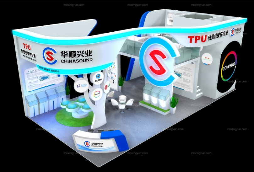 契合華順興業(yè)的品牌形象和產(chǎn)品特性,采用曲線、框型結(jié)構(gòu),再搭配燈具燈光的效果,襯托出展位簡約、融合的氛圍,突出一種高端、舒適的時尚品味。