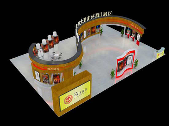 陜西展位外形設計為一幅畫卷,打開畫卷正面是LED大屏,循環(huán)播放陜西近年來創(chuàng)作的舞臺優(yōu)秀劇目和籌辦第十一屆中國藝術節(jié)期間陜西舉辦的各類大活動。畫卷的背面是四排立柱,代表了陜西以周、秦、漢、唐為代表的悠久歷史。立柱上頂四方代表關中平原,兩側(cè)曲面代表陜南、陜北。展位后面是黃河波浪的造型,后浪推前浪代表著三秦兒女自強不息、奮發(fā)向上、勇于拼搏的精神。