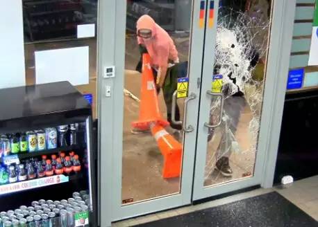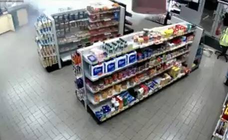 監(jiān)控錄像記錄了事發(fā)的整個(gè)過程:一開始,兩個(gè)帶著作案工具的蒙面盜賊在用力敲擊加油站內(nèi)商店的玻璃門,動作十分兇狠。就在他們將要從被砸破的門洞中鉆進(jìn)室內(nèi)時(shí),商店的一角開始噴發(fā)白色煙霧(仔細(xì)看下圖左上角)。