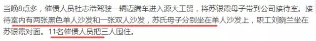 蘇銀霞曾四次撥打110和市長熱線,民警前來簡單了解情況后,蘇銀霞欲一起離開,未果。就在案發(fā)前,民警接到報警再次前來。四分鐘后,留下一句“要賬可以,但是不能動手打人”,準備離開。蘇銀霞公司的員工于秀榮試圖攔下警車。“警察這時候走了,他娘倆只有死路一條。我站在車前說,他娘倆要死了咋辦,你們要走就把我軋死。”