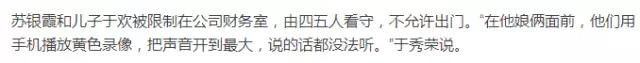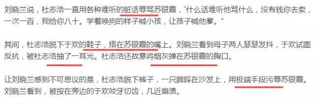 吳學占讓手下拉屎,并將蘇銀霞按進馬桶里,要求還錢。案發(fā)當天,蘇銀霞和于歡母子被關在了一起。“什么話難聽他罵什么,沒有錢你去賣,一次一百,我給你八十。學著喚狗的樣子喊小孩,讓孩子喊他爹。”杜志浩脫下于歡的鞋子,捂在蘇銀霞的嘴上。杜志浩脫下褲子,一只腳踩在沙發(fā)上,用極端手段污辱蘇銀霞。一個小時后,失控的于歡,抄起水果刀瘋狂捅向逼債者,結果四人中刀,其中杜志浩失血過多死亡。