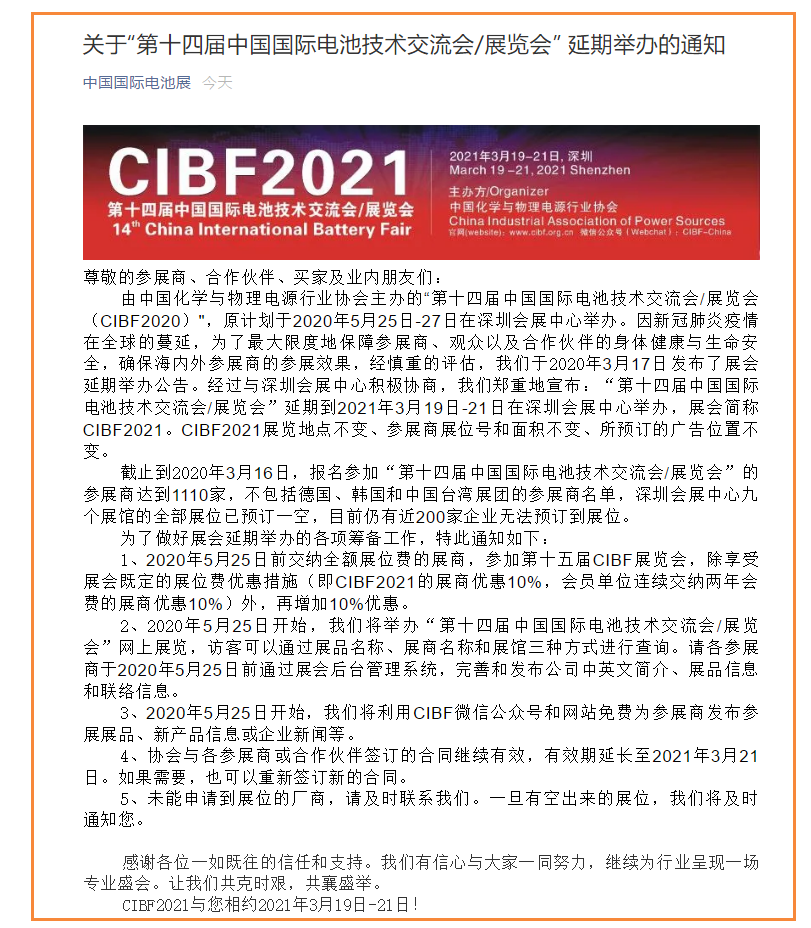 根據(jù)電池展設(shè)計(jì)搭建公司領(lǐng)藝展覽了解到,原計(jì)劃于2020年5月25日-27日在深圳會(huì)展中心舉辦。因新冠肺炎疫情在全球的蔓延,為了最大限度地保障參展商、觀眾以及合作伙伴的身體健康與生命安全,確保海內(nèi)外參展商的參展效果,經(jīng)慎重的評估,我們于2020年3月17日發(fā)布了展會(huì)延期舉辦公告。經(jīng)過與深圳會(huì)展中心積極協(xié)商,我們鄭重地宣布:“第十四屆中國國際電池技術(shù)交流會(huì)/展覽會(huì)”延期到2021年3月19日-21日在深圳會(huì)展中心舉辦,展會(huì)簡稱CIBF2021。如需電池展設(shè)計(jì)請聯(lián)系領(lǐng)藝展覽,希望我們能在電池展搭建上為您添磚加瓦,祝各位朋友收獲多多,滿載而歸!