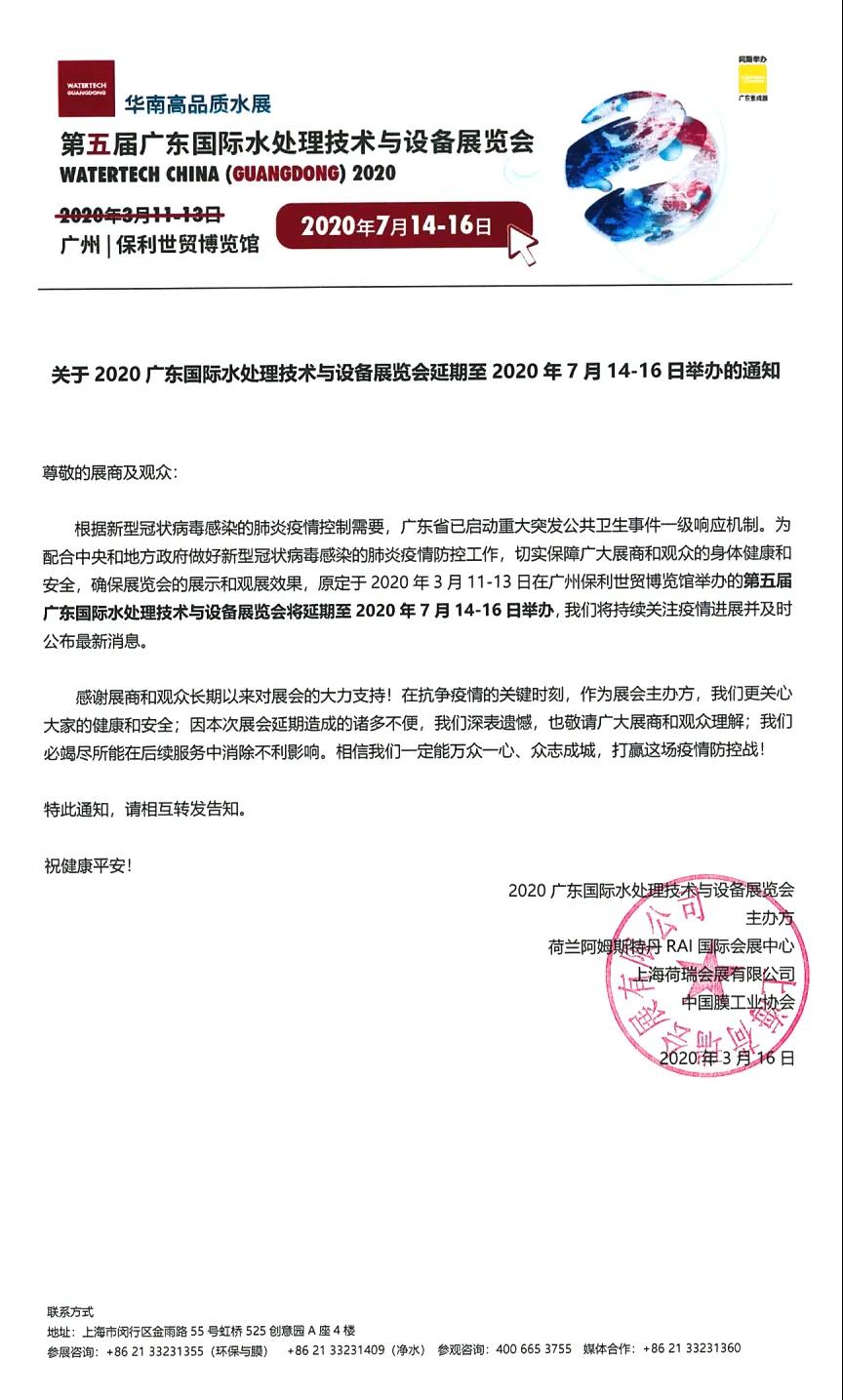 根據(jù)國際水展設(shè)計搭建公司領(lǐng)藝展覽了解到,受新冠肺炎疫情影響,原定于2020年3月11-13日在廣州保利世貿(mào)博覽館舉辦的2020廣東國際水處理技術(shù)與設(shè)備展覽會將延期至2020年7月14-16日舉辦。。如需國際水展設(shè)計請聯(lián)系領(lǐng)藝展覽,希望我們能在國際水展搭建上為您添磚加瓦,祝各位朋友收獲多多,滿載而歸!