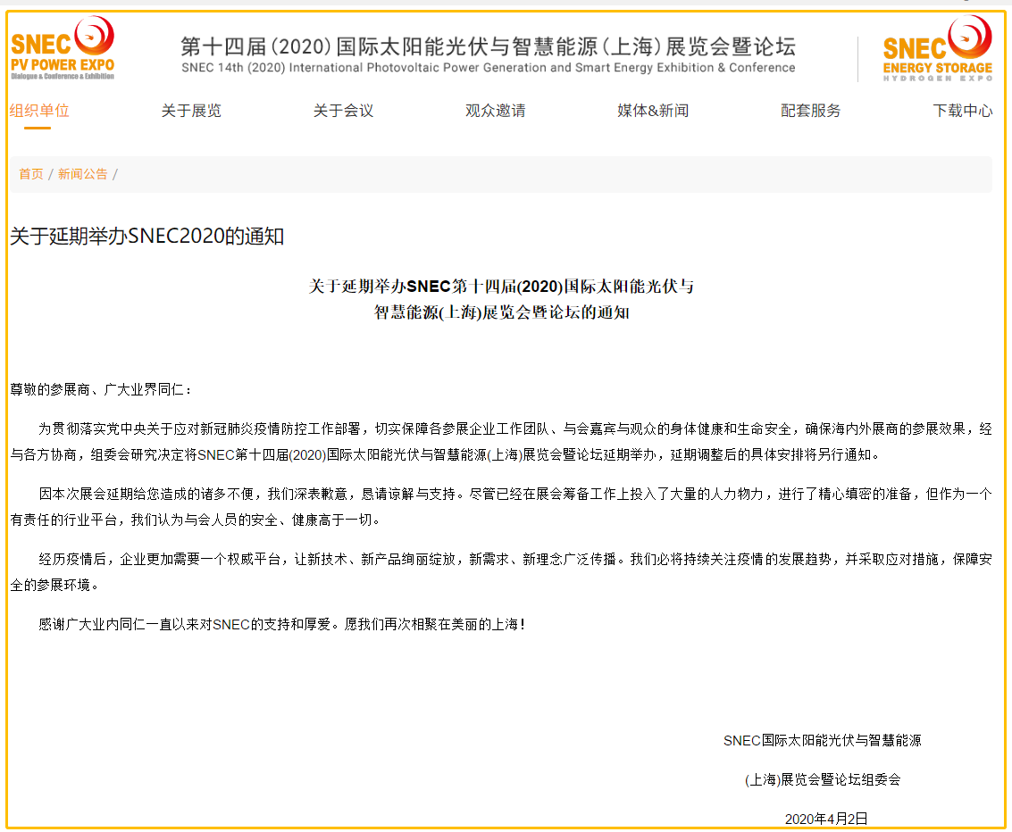 根據(jù)光伏展設(shè)計搭建公司領(lǐng)藝展覽了解到,為貫徹落實黨中央關(guān)于應(yīng)對新冠肺炎疫情防控工作部署,切實保障各參展企業(yè)工作團隊、與會嘉賓與觀眾的身體健康和生命安全,確保海內(nèi)外展商的參展效果,經(jīng)與各方協(xié)商,組委會研究決定將SNEC第十四屆(2020)國際太陽能光伏與智慧能源(上海)展覽會暨論壇延期舉辦,延期調(diào)整后的具體安排將另行通知。如需光伏展設(shè)計請聯(lián)系領(lǐng)藝展覽,希望我們能在光伏展搭建上為您添磚加瓦,祝各位朋友收獲多多,滿載而歸!