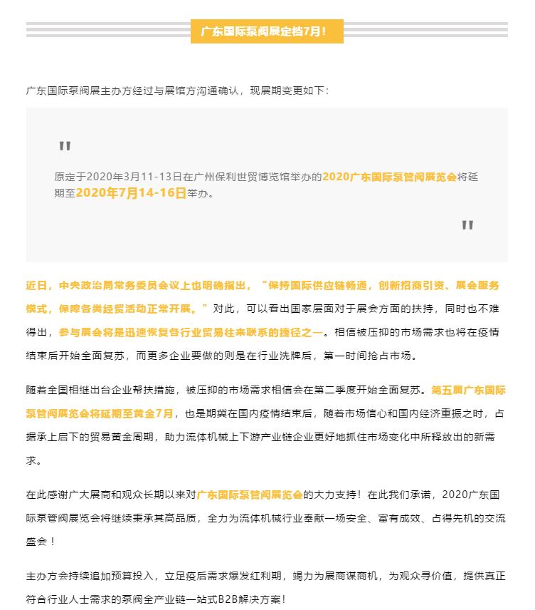 根據(jù)泵閥展設(shè)計(jì)搭建公司領(lǐng)藝展覽了解到,隨著全國相繼出臺企業(yè)幫扶措施,被壓抑的市場需求相信會(huì)在第二季度開始全面復(fù)蘇。第五屆廣東國際泵管閥展覽會(huì)將延期至黃金7月,也是期冀在國內(nèi)疫情結(jié)束后,隨著市場信心和國內(nèi)經(jīng)濟(jì)重振之時(shí),占據(jù)承上啟下的貿(mào)易黃金周期,助力流體機(jī)械上下游產(chǎn)業(yè)鏈企業(yè)更好地抓住市場變化中所釋放出的新需求。如需泵閥展設(shè)計(jì)請聯(lián)系領(lǐng)藝展覽,希望我們能在泵閥展搭建上為您添磚加瓦,祝各位朋友收獲多多,滿載而歸!
