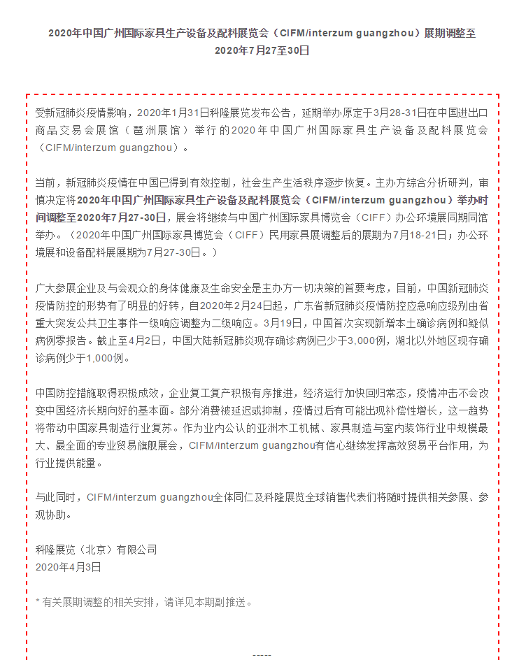 根據(jù)家具展設(shè)計搭建公司領(lǐng)藝展覽了解到,2020年中國廣州國際家具生產(chǎn)設(shè)備及配料展覽會(CIFM/interzum guangzhou)舉辦時間調(diào)整至2020年7月27-30日,展會將繼續(xù)與中國廣州國際家具博覽會(CIFF)辦公環(huán)境展同期同館舉辦。(2020年中國廣州國際家具博覽會(CIFF)民用家具展調(diào)整后的展期為7月18-21日;辦公環(huán)境展和設(shè)備配料展展期為7月27-30日。)如需家具展設(shè)計請聯(lián)系領(lǐng)藝展覽,希望我們能在家具展搭建上為您添磚加瓦,祝各位朋友收獲多多,滿載而歸!
