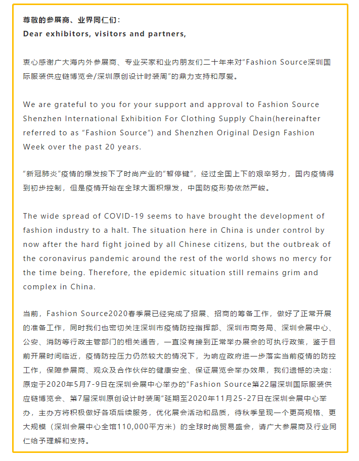 根據(jù)服裝展設(shè)計(jì)搭建公司領(lǐng)藝展覽了解到,原定于2020年5月7-9日在深圳會(huì)展中心舉辦的“Fashion Source第22屆深圳國(guó)際服裝供應(yīng)鏈博覽會(huì)、第7屆深圳原創(chuàng)設(shè)計(jì)時(shí)裝周“延期至2020年11月25-27日在深圳會(huì)展中心舉辦,主辦方將積極做好各項(xiàng)后續(xù)服務(wù),優(yōu)化展會(huì)活動(dòng)和品質(zhì),待秋季呈現(xiàn)一個(gè)更高規(guī)格、更大規(guī)模(深圳會(huì)展中心全館110,000平方米)的全球時(shí)尚貿(mào)易盛會(huì),請(qǐng)廣大參展商及行業(yè)同仁給予理解和支持。如需服裝展設(shè)計(jì)請(qǐng)聯(lián)系領(lǐng)藝展覽,希望我們能在服裝展搭建上為您添磚加瓦,祝各位朋友收獲多多,滿載而歸!