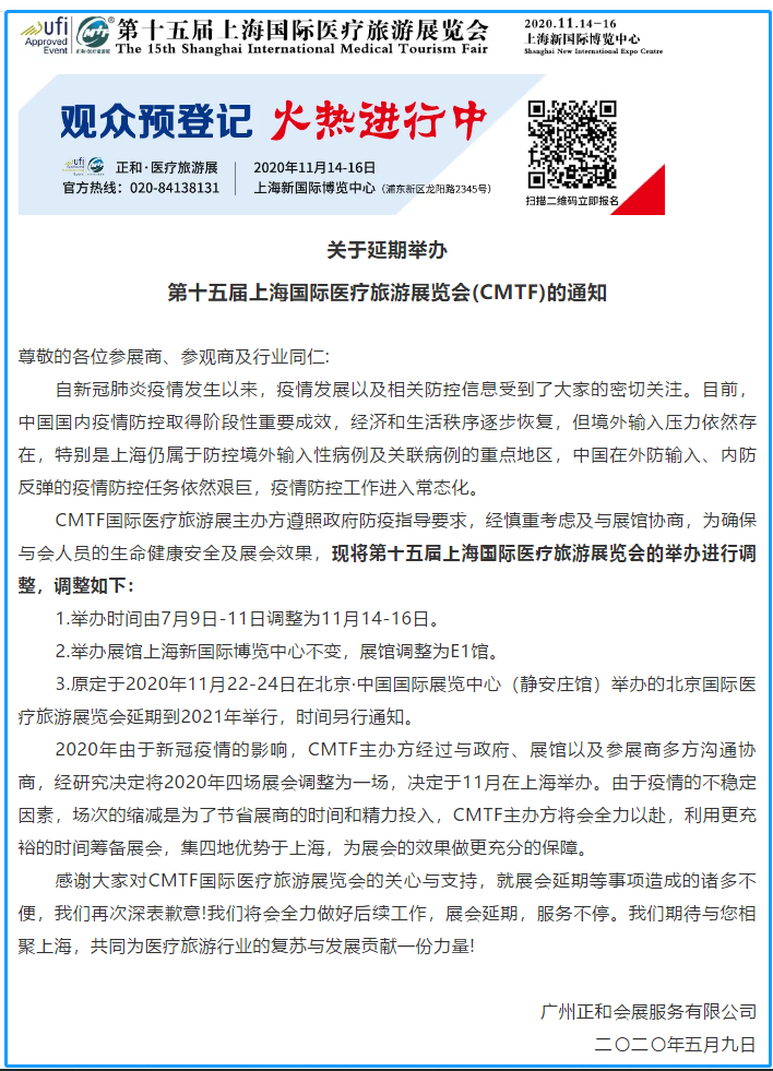 上海醫(yī)療展設(shè)計(jì)搭建公司領(lǐng)藝展覽了解到,CMTF國(guó)際醫(yī)療旅游展主辦方遵照政府防疫指導(dǎo)要求,經(jīng)慎重考慮及與展館協(xié)商,為確保與會(huì)人員的生命健康安全及展會(huì)效果,現(xiàn)將第十五屆上海國(guó)際醫(yī)療旅游展覽會(huì)的舉辦進(jìn)行調(diào)整,舉辦時(shí)間由7月9日-11日調(diào)整為11月14-16日。如需展會(huì)設(shè)計(jì)請(qǐng)聯(lián)系領(lǐng)藝展覽,希望我們能在上海醫(yī)療展搭建上為您添磚加瓦,祝各位朋友收獲多多,滿載而歸!
