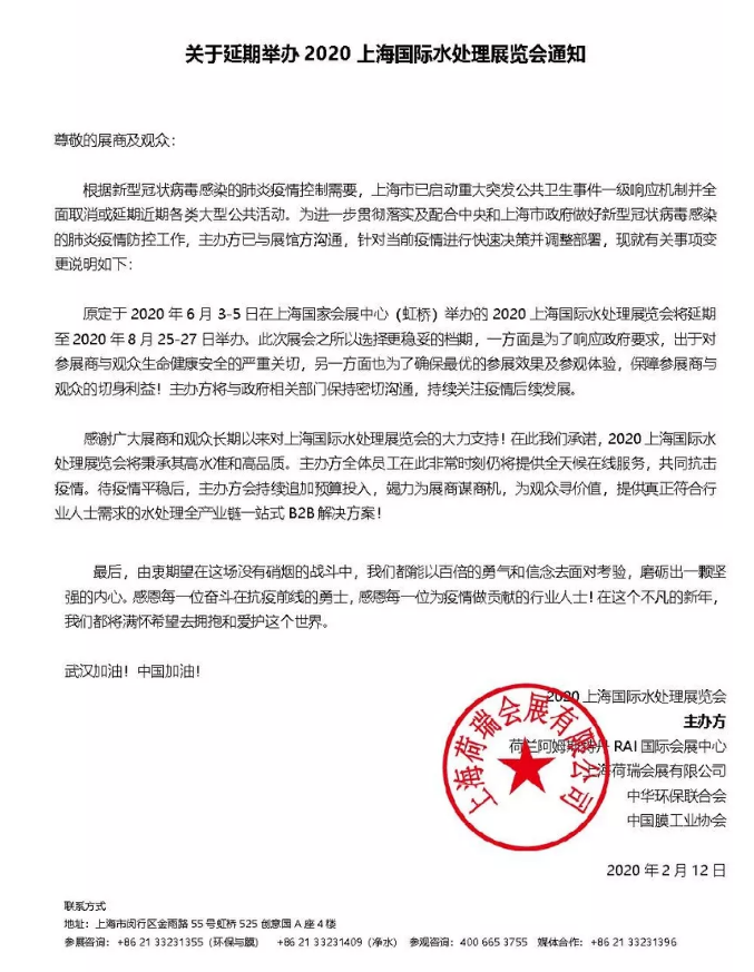 為全力支持打贏疫情防控阻擊戰(zhàn),貫徹落實(shí)上海市疫情防控工作領(lǐng)導(dǎo)小組的防疫工作指導(dǎo)方針,切實(shí)保障廣大展商和觀眾的身體健康和安全,確保展覽會(huì)的展示和觀展效果,原定于2020年6月3-5日在上海國(guó)家會(huì)展中心(虹橋)舉辦的2020上海國(guó)際水處理展覽會(huì)將延期至2020年8月25-27日舉辦。我們將繼續(xù)密切關(guān)注展會(huì)動(dòng)態(tài),希望我們能在上海水展搭建上為您添磚加瓦。!上海水展設(shè)計(jì)搭建公司領(lǐng)藝展覽在此非常時(shí)刻仍將提供全天候在線服務(wù),共同抗擊疫情。預(yù)祝各位朋友收獲多多,滿載而歸!