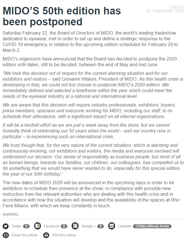 根據(jù)光學(xué)眼鏡展設(shè)計(jì)搭建公司領(lǐng)藝展覽了解到,全球規(guī)模最大的眼鏡專業(yè)展——米蘭國(guó)際光學(xué)眼鏡展主辦方宣布,鑒于疫情把每年一度的展會(huì)推遲到5月底至6月中旬,具體日期仍有待決定。如需光學(xué)展設(shè)計(jì)請(qǐng)聯(lián)系領(lǐng)藝展覽,希望我們能在眼鏡展搭建上為您添磚加瓦,祝各位朋友收獲多多,滿載而歸!