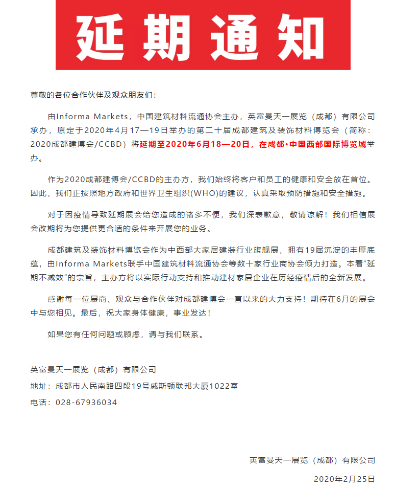 根據(jù)成都建博會設計搭建公司領藝展覽了解到,由Informa Markets,中國建筑材料流通協(xié)會主辦,英富曼天一展覽(成都)有限公司承辦,原定于2020年4月17—19日舉辦的第二十屆成都建筑及裝飾材料博覽會(簡稱:2020成都建博會/CCBD)將延期至2020年6月18—20日,在成都·中國西部國際博覽城舉辦。