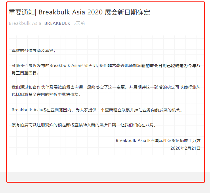 根據(jù)亞洲國際件雜貨運(yùn)輸展設(shè)計(jì)搭建公司領(lǐng)藝展覽了解到,緊隨著主辦最近發(fā)布的Breakbulk Asia延期聲明, 我們非常高興地通知原定于2020年3月18日至19日在上海世博展覽館舉辦的Breakbulk Asia亞洲國際件雜貨運(yùn)輸展覽會(huì)新的展會(huì)日期已經(jīng)確定為今年八月三日至四日。如需物流展設(shè)計(jì)請聯(lián)系領(lǐng)藝展覽,希望我們能在物流展搭建上為您添磚加瓦,祝各位朋友收獲多多,滿載而歸!