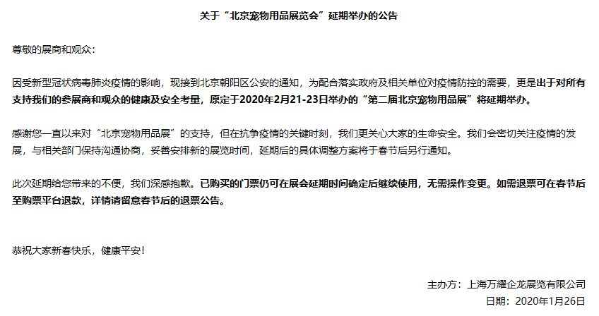 根據(jù)北京寵物展設(shè)計搭建公司領(lǐng)藝展覽了解到,因受新型冠狀病毒肺炎疫情的影響,主辦方為配合落實政府及相關(guān)單位對疫情防控的需要,更是出于對所有支持我們的參展商和觀眾的健康及安全考量,原定于2020年2月21-23日舉辦的“第二屆北京寵物用品展”將延期舉辦。如需北京寵物展設(shè)計請聯(lián)系領(lǐng)藝展覽,希望我們能在北京寵物展搭建上為您添磚加瓦,祝各位朋友收獲多多,滿載而歸!