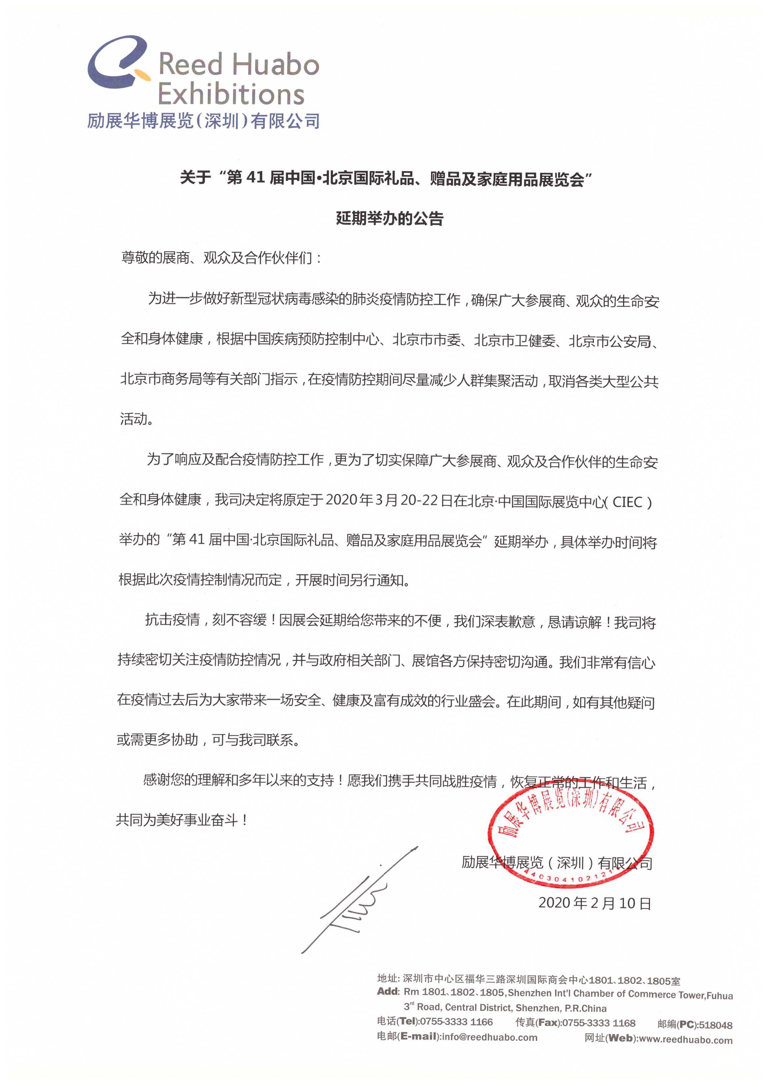 為進一步做好新型冠狀病毒感染的肺炎疫情防控工作,確保廣大參展商、觀眾的生命安全和身體健康,根據(jù)中國疾病預(yù)防控制中心、北京市市委、北京市衛(wèi)委、北京市公安局、北京市商務(wù)局等有關(guān)部門指示,在疫情防控期間盡量減少人群集聚活動,取消各類大型公共活動。