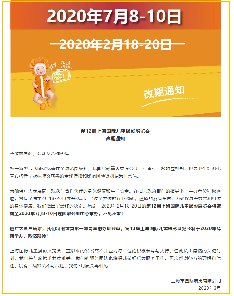 根據上海展臺設計搭建公司領藝展覽了解到,原定于2020年2月18-20日的第12屆上海國際兒童攝影展覽會將延期至2020年7月8-10日在國家會展中心舉辦。如需上海展臺設計請聯系領藝展覽,希望我們能在上海展臺搭建上為您添磚加瓦,祝各位朋友收獲多多,滿載而歸!