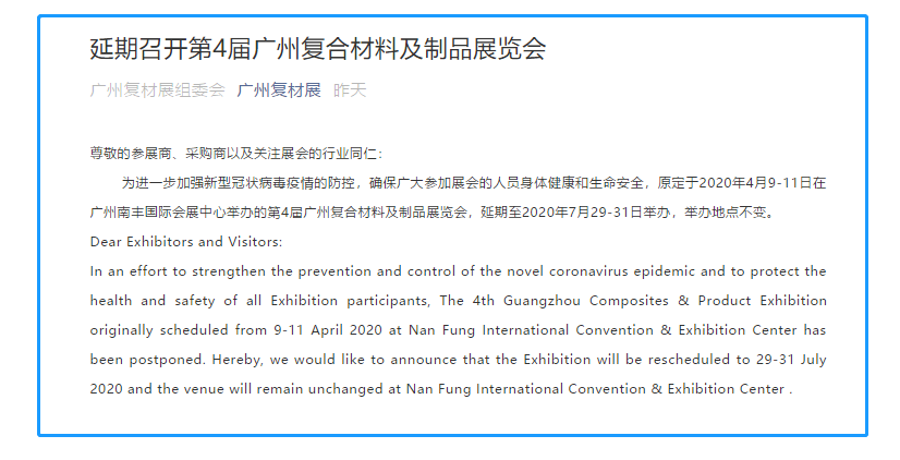 根據(jù)廣州復(fù)材展展臺(tái)設(shè)計(jì)搭建公司領(lǐng)藝展覽了解到,原定于2020年4月9-11日在廣州南豐國際會(huì)展中心舉辦的第4屆廣州復(fù)合材料及制品展覽會(huì),延期至2020年7月29-31日舉辦,舉辦地點(diǎn)不變。如需廣州復(fù)材展展臺(tái)設(shè)計(jì)請(qǐng)聯(lián)系領(lǐng)藝展覽,希望我們能在廣州復(fù)材展展臺(tái)搭建上為您添磚加瓦,祝各位朋友收獲多多,滿載而歸!