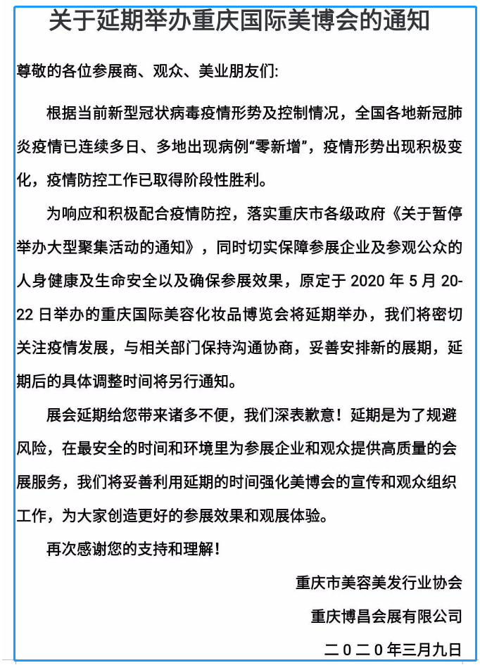 根據(jù)美博會(huì)指定展臺(tái)設(shè)計(jì)搭建公司領(lǐng)藝展覽了解到,因我國(guó)新型冠狀病毒的影響,各省市均已啟動(dòng)一級(jí)響應(yīng),并全面取消或延期各類大型活動(dòng)。為積極配合疫情防治工作的開展,原定于2020年5月20-22日在重慶舉辦的重慶國(guó)際美博會(huì)將延期舉行,如需美博會(huì)展臺(tái)設(shè)計(jì)請(qǐng)聯(lián)系領(lǐng)藝展覽,希望我們能在美博會(huì)展臺(tái)搭建上為您添磚加瓦,祝各位朋友收獲多多,滿載而歸!