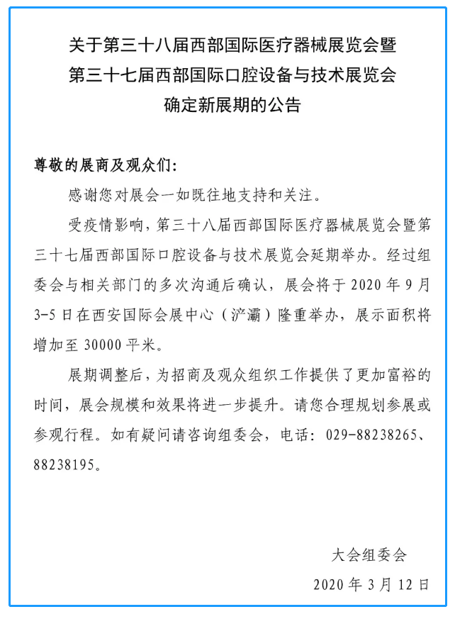 根據西部醫(yī)療展設計搭建公司領藝展覽了解到,受疫情影響,第三十八屆西部國際醫(yī)療器械展覽會調整至2020年9月3-5日在西安國際會展中心(浐灞)隆重舉辦。如需西部醫(yī)療展設計請聯(lián)系領藝展覽,希望我們能在西部醫(yī)療展搭建上為您添磚加瓦,祝各位朋友收獲多多,滿載而歸!