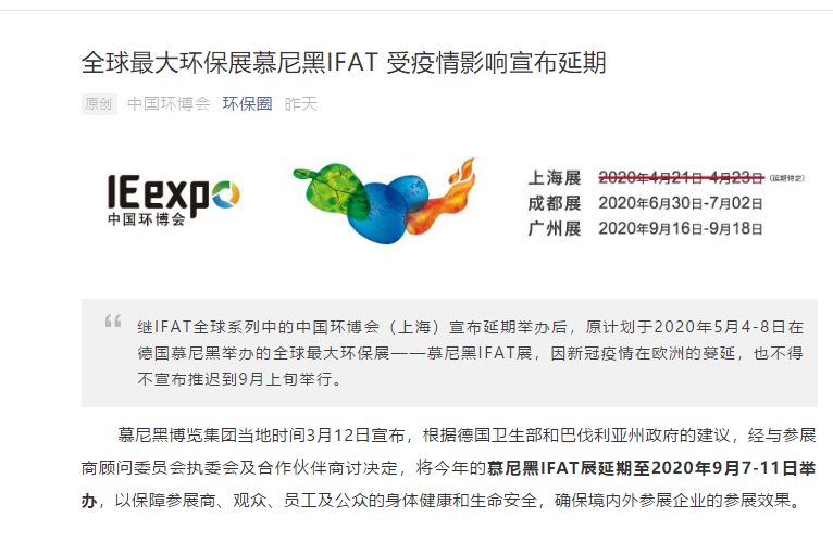 根據(jù)環(huán)保展設(shè)計(jì)搭建公司領(lǐng)藝展覽了解到,慕尼黑博覽集團(tuán)當(dāng)?shù)貢r(shí)間3月12日宣布,根據(jù)德國衛(wèi)生部和巴伐利亞州政府的建議,經(jīng)與參展商顧問委員會(huì)執(zhí)委會(huì)及合作伙伴商討決定,將今年的慕尼黑IFAT展延期至2020年9月7-11日舉辦,以保障參展商、觀眾、員工及公眾的身體健康和生命安全,確保境內(nèi)外參展企業(yè)的參展效果。如需環(huán)保展設(shè)計(jì)請聯(lián)系領(lǐng)藝展覽,希望我們能在環(huán)保展搭建上為您添磚加瓦,祝各位朋友收獲多多,滿載而歸!