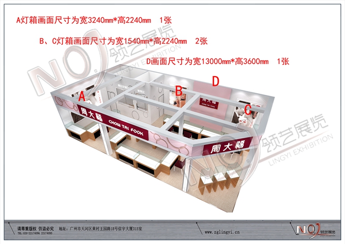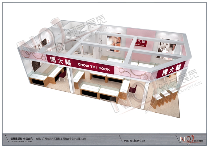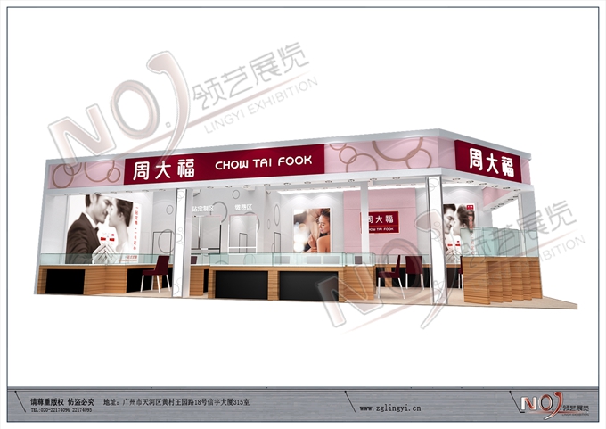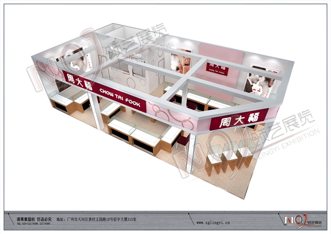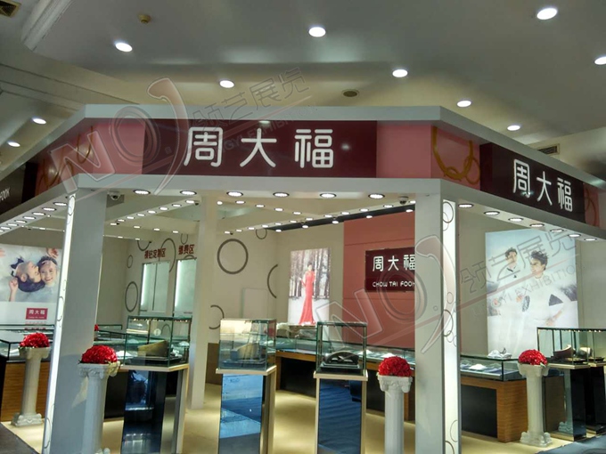 契合周大福的品牌形象和產(chǎn)品特性,采用矩形結(jié)構(gòu),再搭配燈具燈光的效果,襯托出展位高端、時(shí)尚的氛圍,突出一種現(xiàn)代、歐美的時(shí)尚品味。