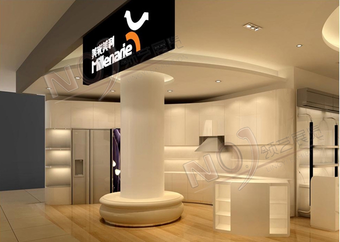 契合的美瓏美利品牌形象和產(chǎn)品特性,采用弧形、矩形結(jié)構(gòu),再搭配燈具燈光的效果,襯托出展位高端、時尚的氛圍,突出一種現(xiàn)代、歐美的時尚品味。